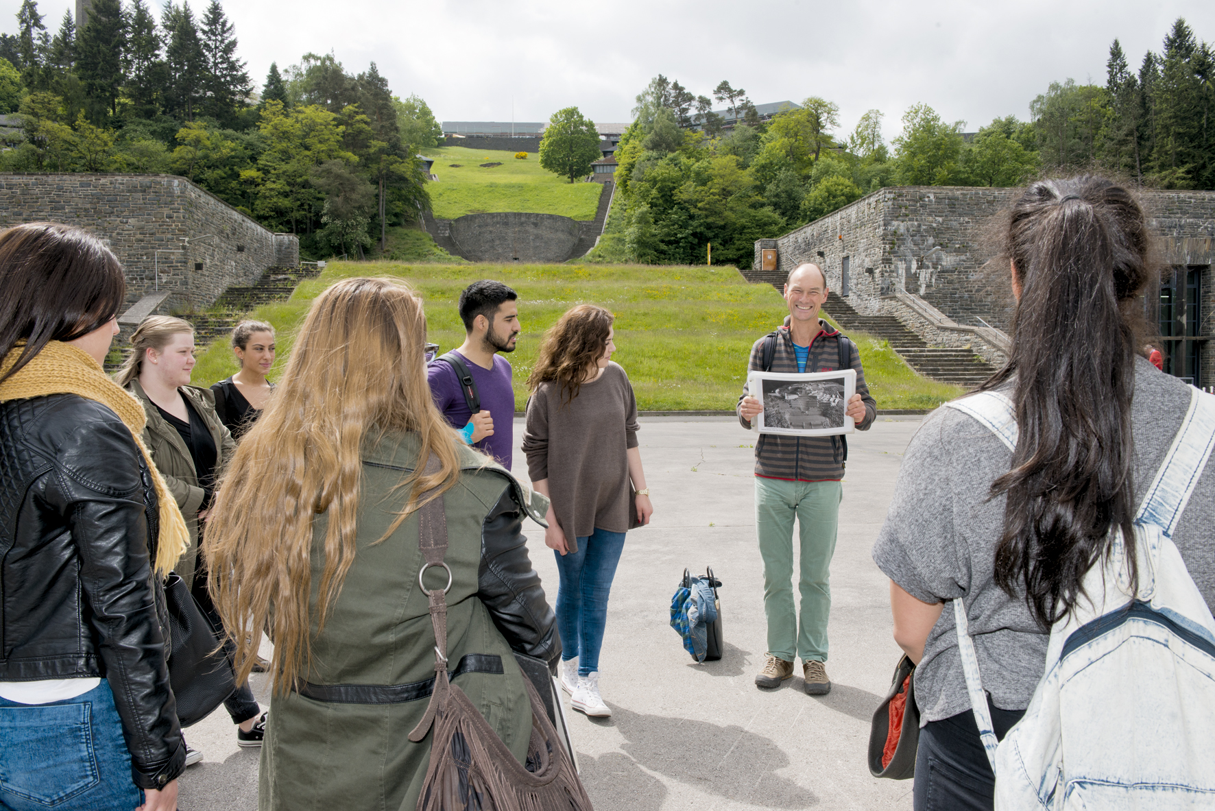 Forum Vogelsang IP'deki ziyaretçi merkezinin çarpıcı yapısı,1930'ların anıtsal yapısıyla karşılıklıdır.Burada konuklar iki sergi arasındanseçim yapabilirler.